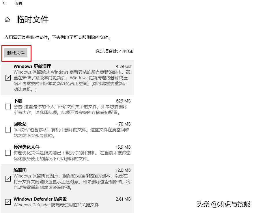 然后点击【临时文件】,选中Windows更新清理删除文件就好,这里其他的文件也可以一并删除。