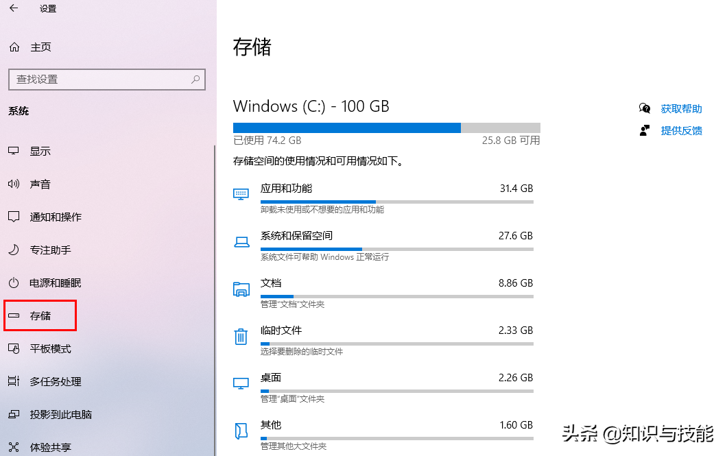 打开电脑设置,点击【系统】,然后将鼠标点击【存储】选项,就可以看到C盘储存空间使用的情况。