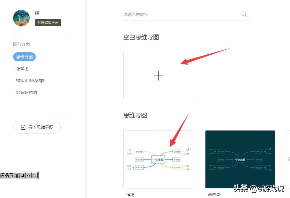 3、找到脑图,先点击“脑图”,然后点击“空白思维导图”。就可以创建导图空白模板了