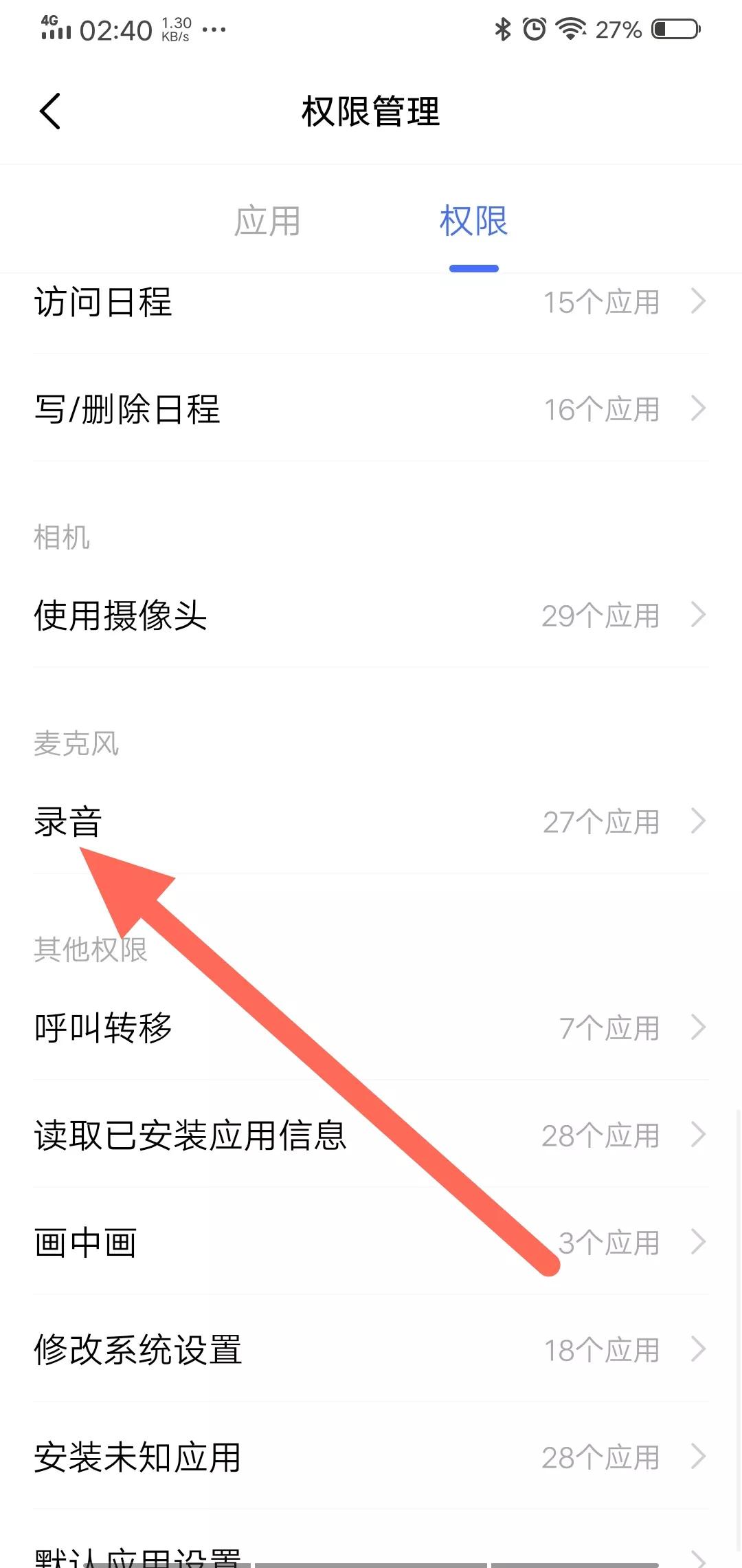在手机上找到i管家 ,点开 i管家, 点开应用管理 ,点开权限管理 , 找到录音功能 ,找到你是使用的软件开启即可 。