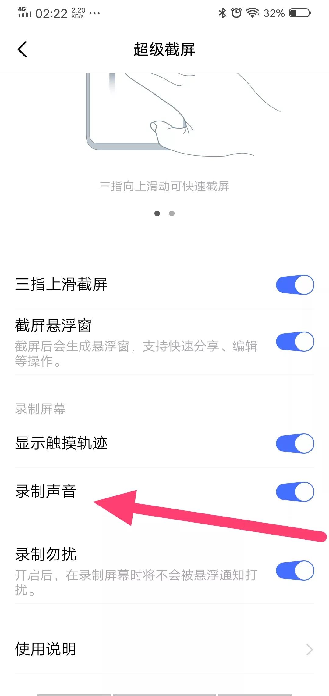 你也可以从屏幕底部往上滑,长按超级截屏,打开录屏声音 。