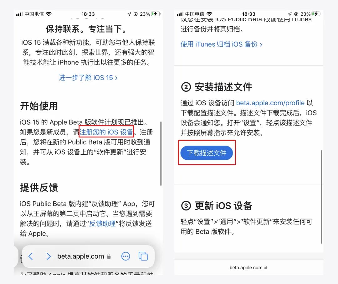 如果仍旧想要升级目前的公测版本,需要注册并登陆Apple Beta版计划并下载最新描述文件,又或者是直接在回复“iOS15”获取描述文件,之后在“设置>通用>设备管理”中安装描述文件,重启后就可以看到系统推送。