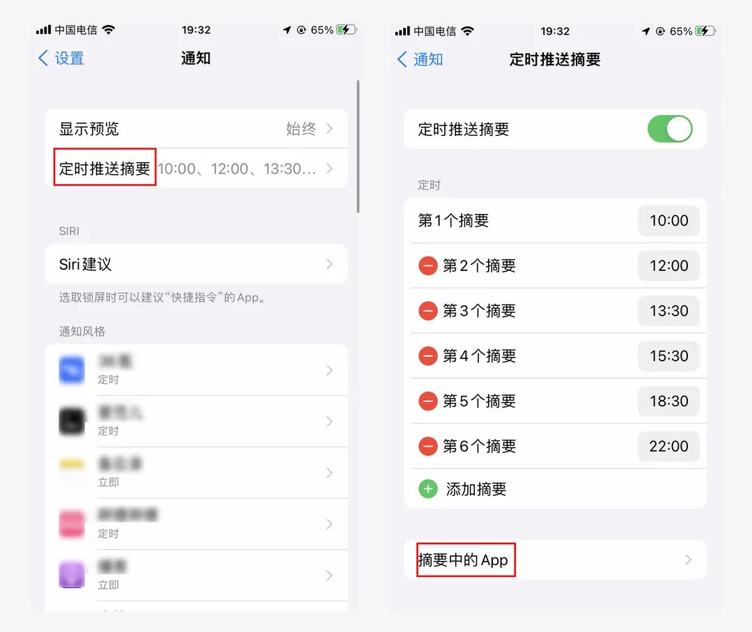 除了设置通知摘要的应用外,一天内还可以最多设置12个时间推送摘要。这一点可以根据个人偏好设定,比如从9点钟开始每隔1-2小时各设置一个时间点。