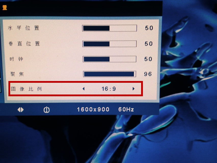 第四种,显示器图像比例问题。我们只要到显示器菜单按钮那里调到图像比例,一般有4:3跟16:9的。你调试到16:9的。如下图所示: