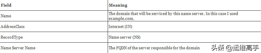 名称服务器(NS)记录列出域的名称服务器。 此记录允许其他名称服务器在您的域中查找名称。 区域文件可能包含多个名称服务器记录。 这些记录的格式很简单: