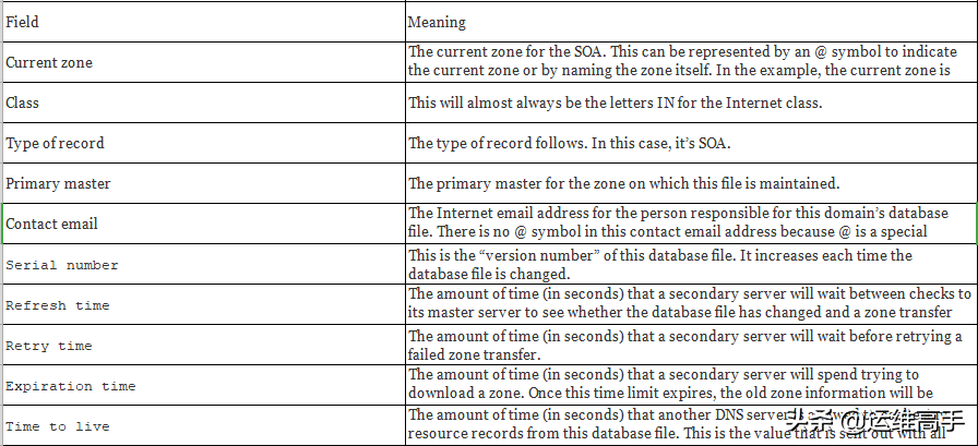数据库文件中的第一条记录是权限开始(SOA)记录。 SOA定义DNS区域的常规参数,包括区域的权威服务器的标识。