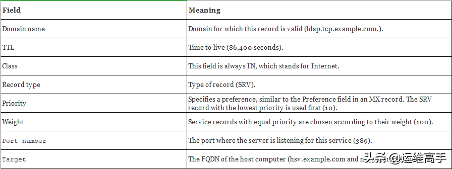 服务(SRV)记录将服务的位置(如域控制器)与有关如何联系服务的信息联系在一起。 SRV记录提供七项信息。 让我们回顾一个例子来帮助澄清这个强大的概念。 (表3.4解释了以下示例中的字段。)