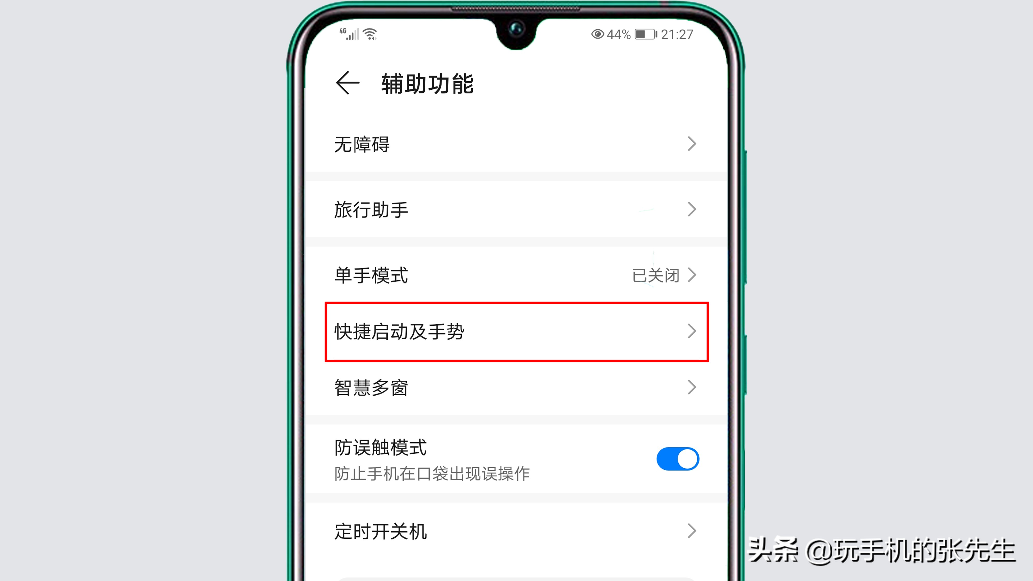 3、在“辅助功能”功能列表中,点击“快捷启动及手势”。