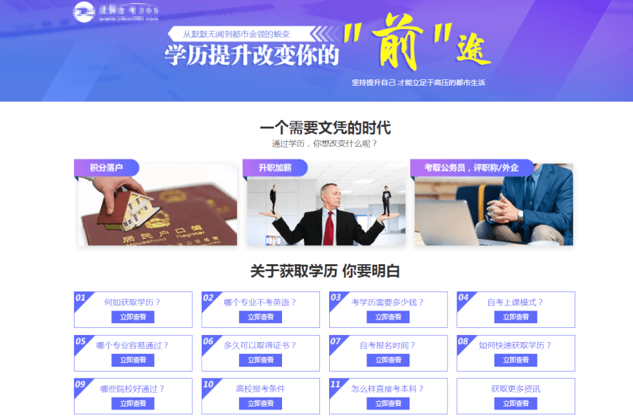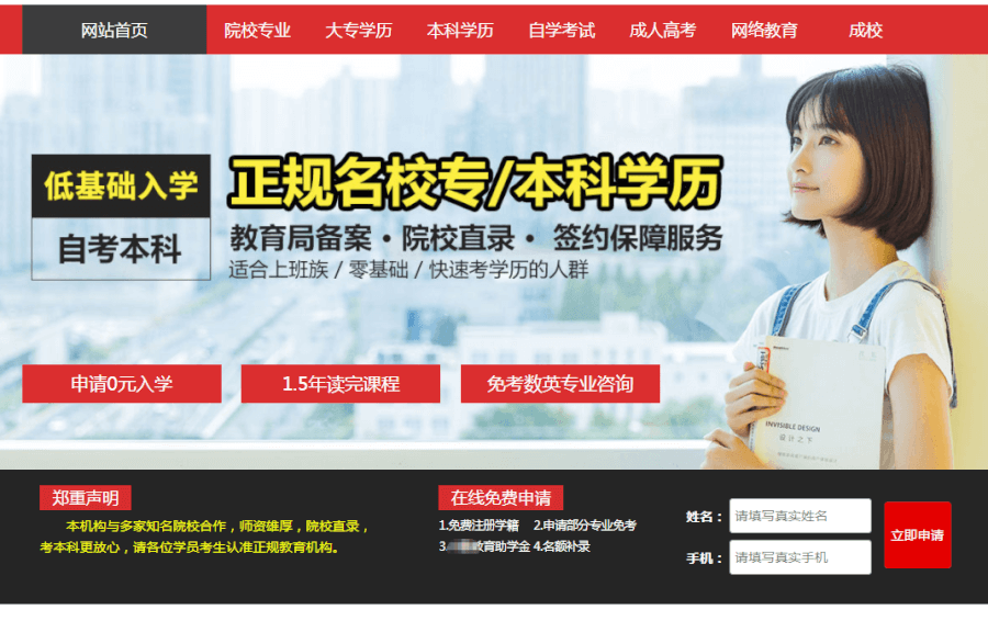 一是图片比较真实,做过学历教育的应该很多人都看到过这张图。虽然普遍,但是很真实。很多机构会选择放外国人照片或者一些非真人照片,这些都不够真实。图片这块,越真实就会显得越原生可相信,越虚拟就会越难以信服。尤其是对于学历教育这样的行业来说,校园图、学生图、场景图会更具有吸引力。