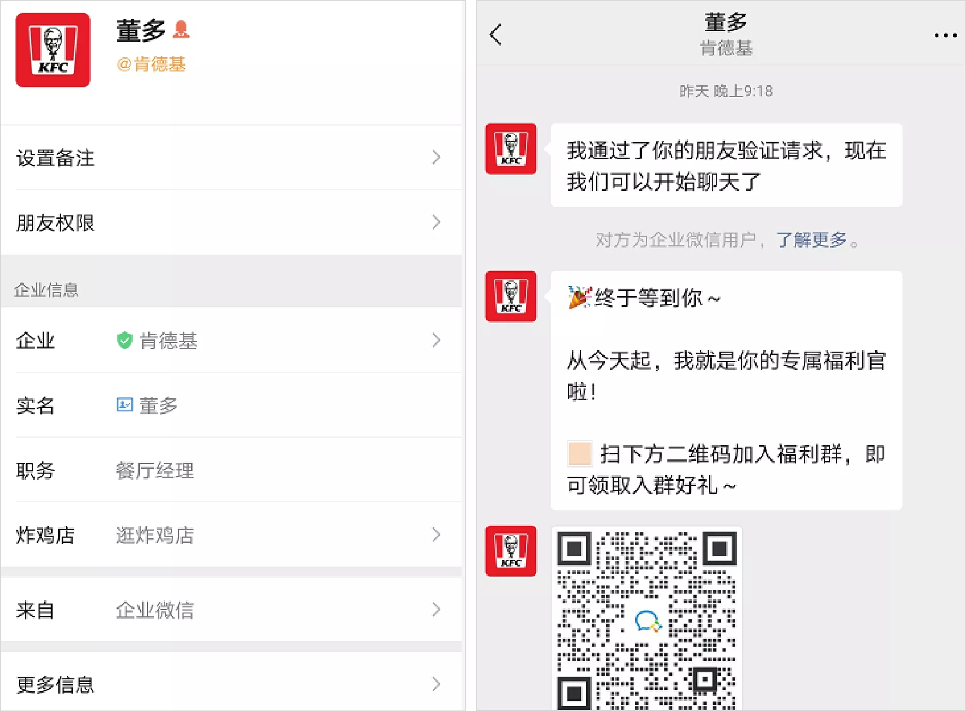 肯德基的群主就是该店面的负责人,你不仅可以在资料页看到 ta 的企业认证、店长职位,还可以看到 ta 的真实姓名。