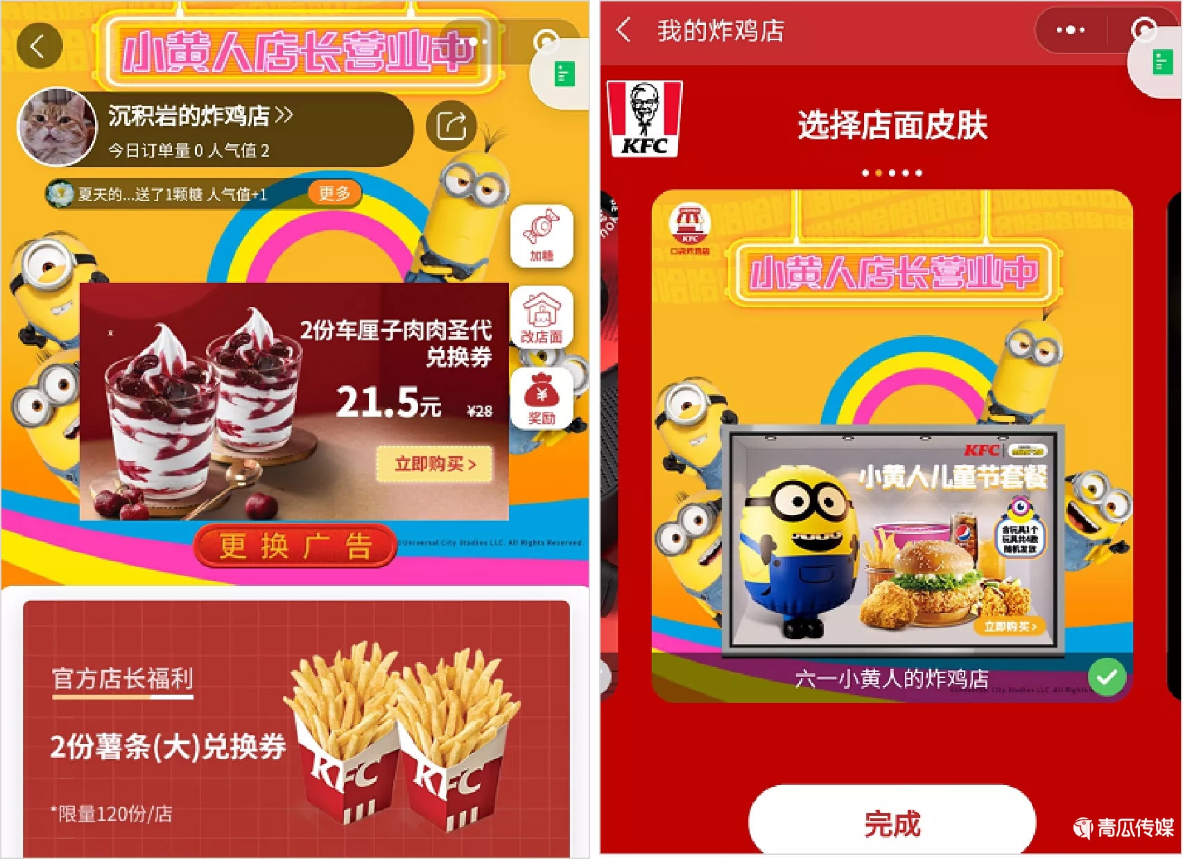 肯德基的口袋炸鸡店,不仅能够让用户以个人名义线上开店,满足用户的猎奇心理;还可以让用户通过更换皮肤装点自己的炸鸡店。