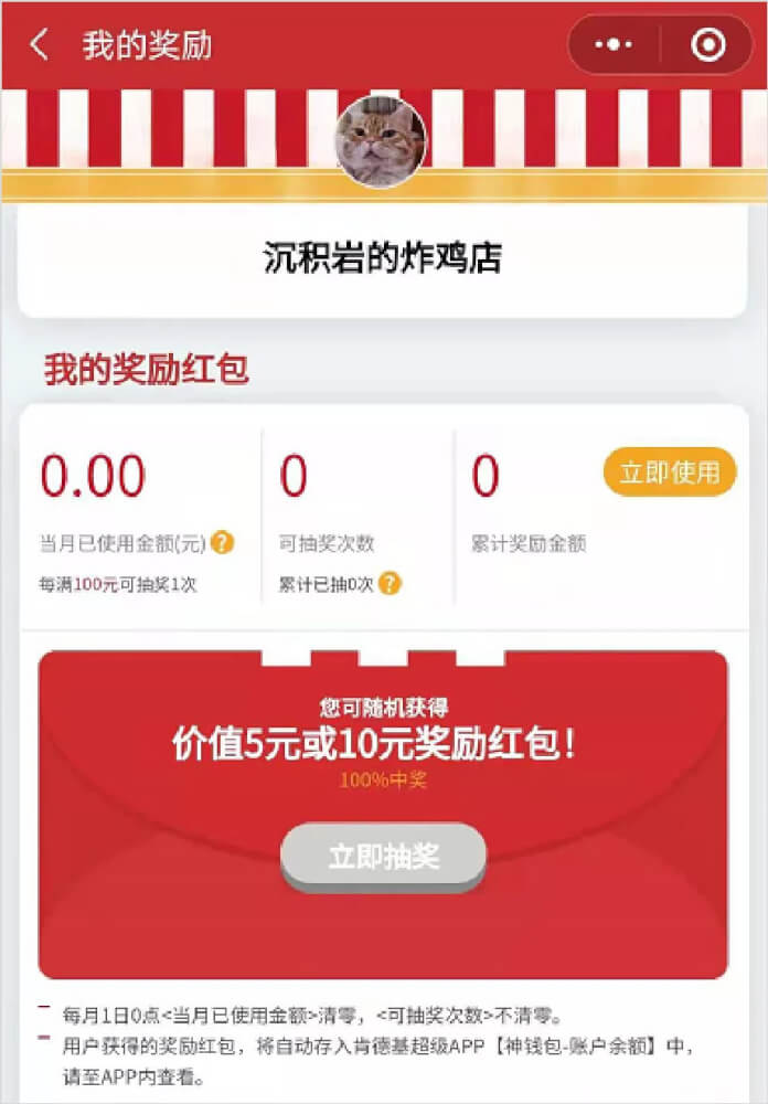 该用户的炸鸡店,每产生一百块的交易额,ta 就能够得到 5 到 10 元的优惠券。