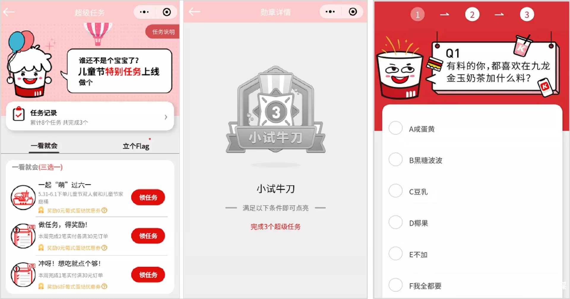 值得注意的是,这些任务的完成方式有两种,一种是用户通过填写问卷的方式获得勋章,另一种则是通过下单获得勋章。