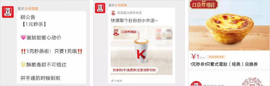 最后,肯德基还会不定期在群里发起各种各样的“ 秒杀”活动,刺激用户持续关注: