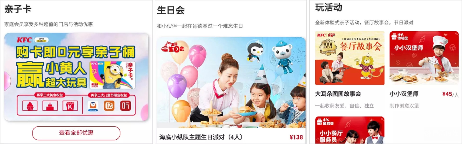 家里有小朋友的用户,不仅可以通过小程序报名“餐厅故事会”、“制作创意汉堡”和“体验餐厅服务员”等亲子活动,为孩子预约肯德基主题生日派对,还可以购买亲子卡,享受亲子折扣价……
