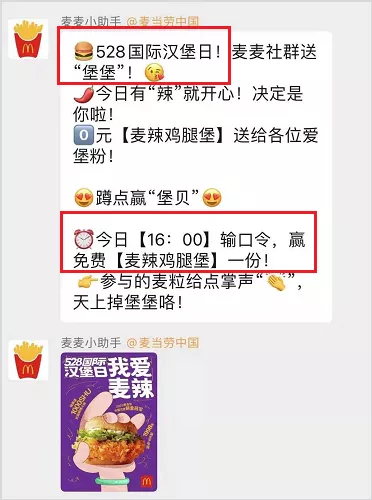 比如,因为 5 月 28 日是“国际汉堡日”,于是麦当劳在下午 4 点发起了送汉堡的活动……