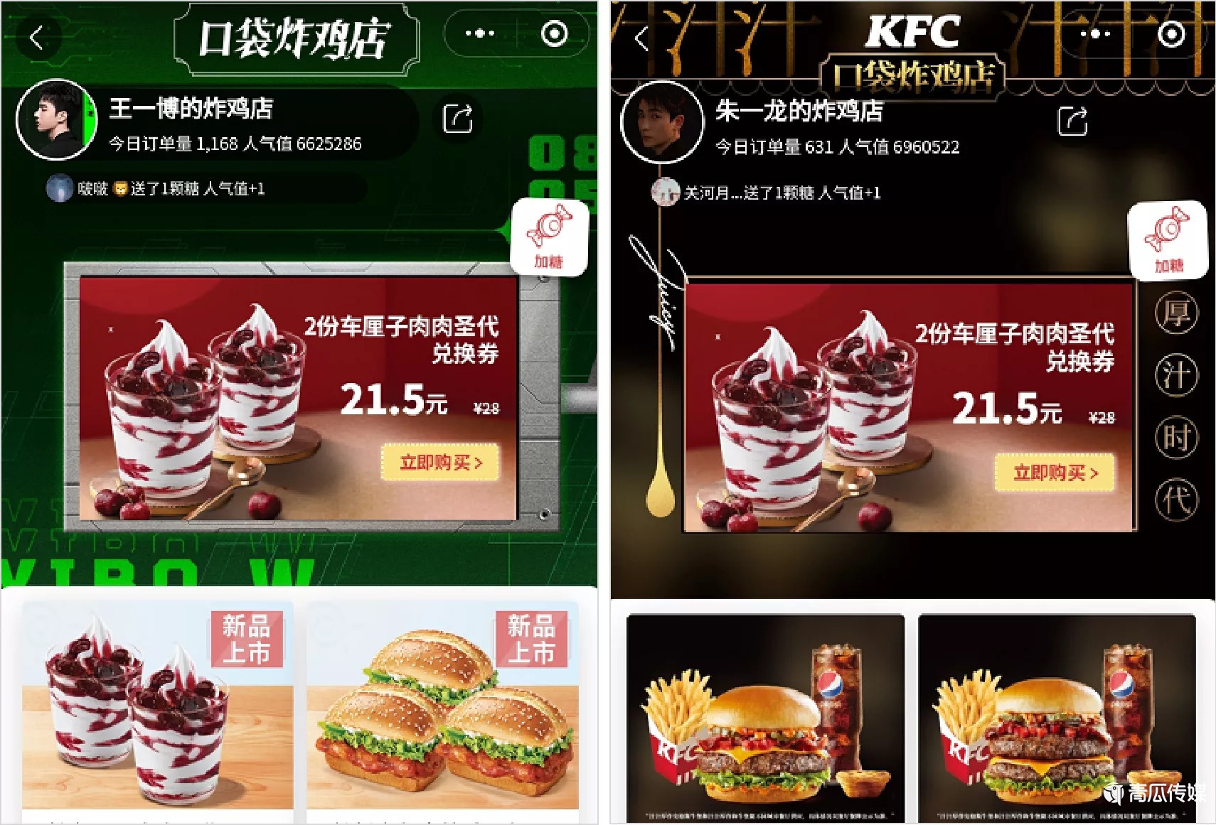 肯德基巧妙地将 ta 和当红明星结合在一起,让每个明星都拥有对应的“炸鸡店”,比如,王一博的炸鸡店、朱一龙的炸鸡店和王源的炸鸡店等……