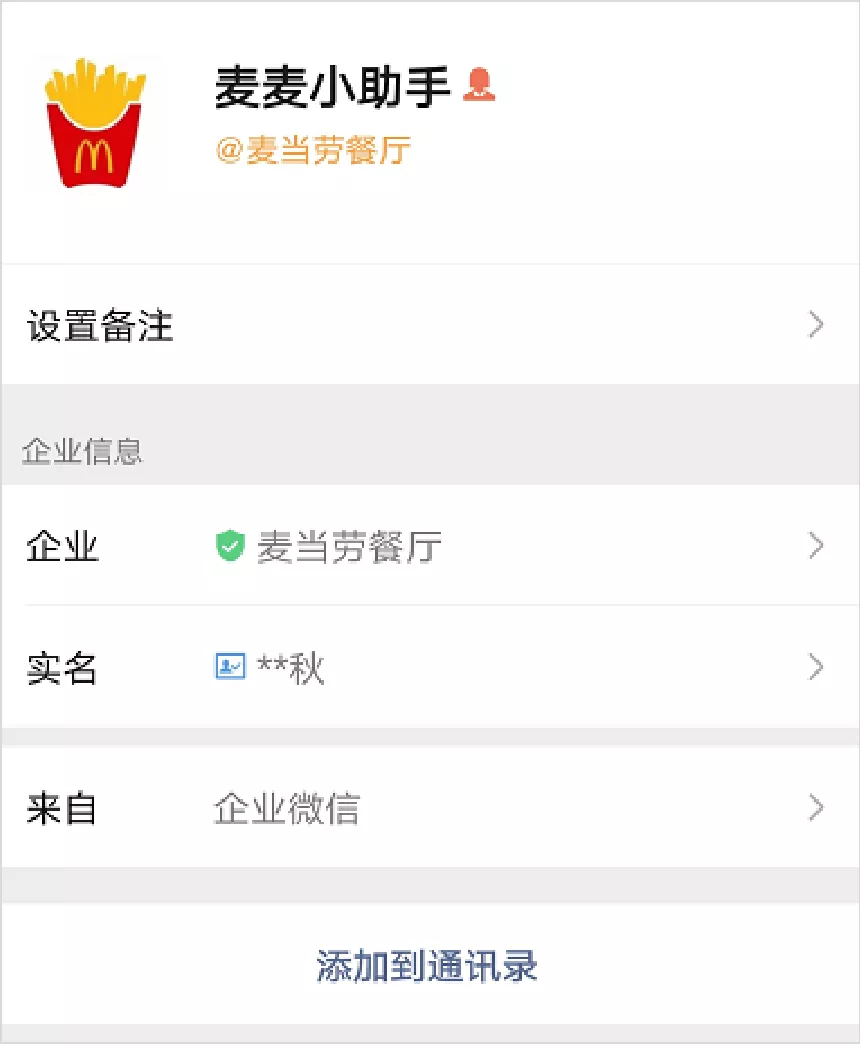 此外,从添加页面上看,麦当劳这个店长的名片也十分简陋,只有麦当劳餐厅的企业认证和实名认证。