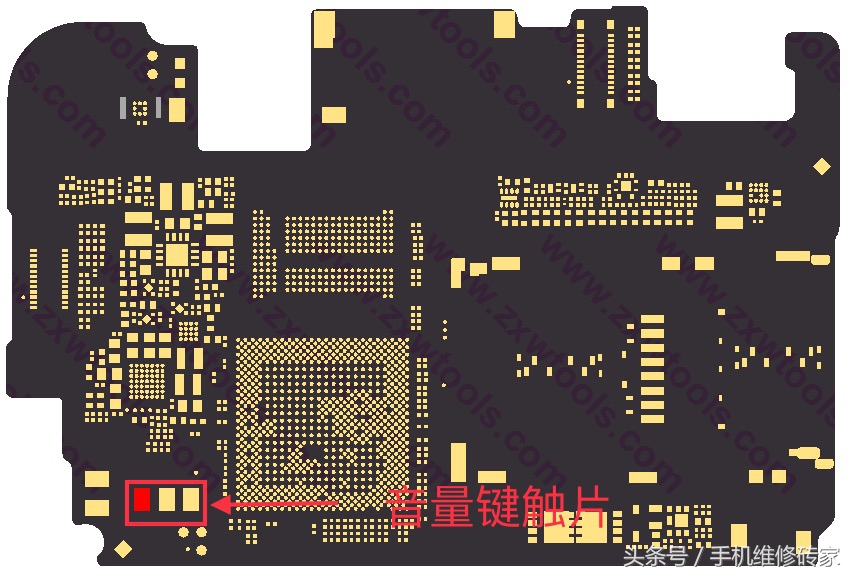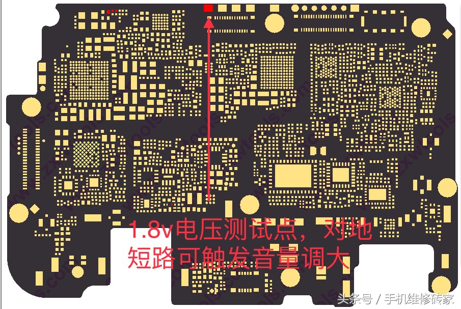 红色区域为音量加键测试点,该处应有1.8V电压,对地短路可触发音量加键工作
