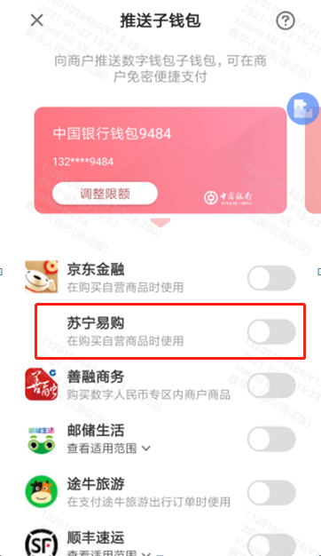然后,消费者需要向苏宁易购推送子钱包,相当于在苏宁易购开通某行数字人民币的支付方式。具体操作流程是,在数字人民币里打开苏宁易购“推送子钱包”的开关,允许子钱包推送。