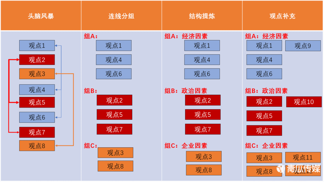 若是遇到复杂的问题,可以使用4个步骤展开:头脑风暴-连线分组-结构提炼-观点补充