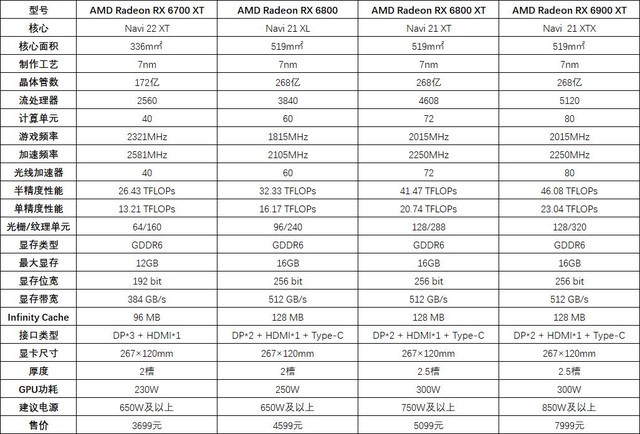 首先我们先来看看AMD公版卡的各项参数,目前RX 6800/6800 XT/6900 XT显卡采用的都是Navi 21芯片,但具体型号有所区别,而RX 6700 XT采用了Navi 22芯片,相比Navi 21的面积小了很多。