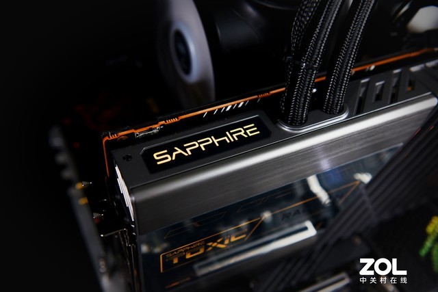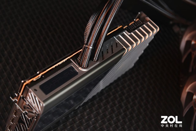 在外观上,这一代的毒药首次采用了风水混合分离式散热,看起来就很“唬人”,而实际的散热表现也令人相当满意。独特的黑橙配色,彰显着毒药系列与众不同的身份,这款显卡全身多处均搭载ARGB灯效,包括顶部“SAPPHIRE”信仰灯、本体风扇以及冷排风扇等,显卡末端还内置了5V ARGB接口,使用ARGB同步连接线连接主板,即可帮助玩家完成个性化的整机灯效。