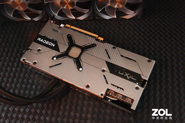 另外此次蓝宝石RX 6900 XT毒药超极版采用的是风水混合分离式散热,水冷部分主要为核心提供散热,在卡身还搭载了刀刃式轴流风扇,它的作用主要是为显存和供电模组等发热量大的元器件散热,搭配内部的两根热管,可快速排出热量。