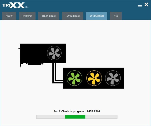 好了,到这里就是超频前的最后准备,在风扇检测选项卡中可以自动监测每个风扇的运行状况,系统会逐一排查,检测过后没有问题的风扇即为绿色。