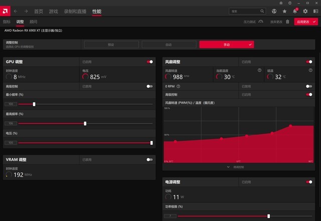 在驱动的性能界面中,原本自动一栏已经转变为手动。可以看到在打开TOXIC Boost后,最大频率已经提升至106%,电源和风扇的手动调整也已经解锁,不过在在该状态下已经是官方调教好的状态,无需再次调节。