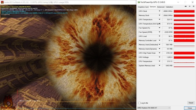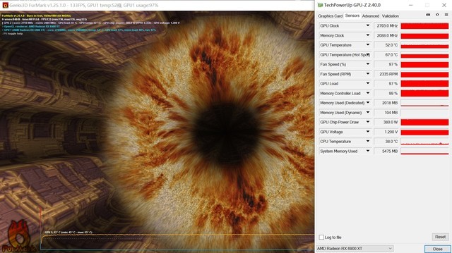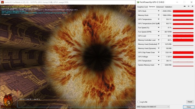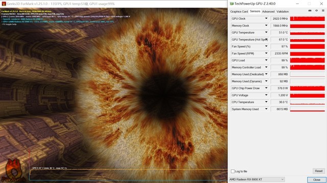 在温度测试方面,显卡均通过FurMark拷机软件进行拷机测试,通过数据的对比不难发现蓝宝石RX 6900 XT毒药超极版对比公版,在散热方面的提升巨大,水冷+风冷的混合分离式散热让显卡几乎很难超过55℃。另外在超极模式中,笔者解锁了风扇转速,所以虽然频率更高,但温度却更低了。