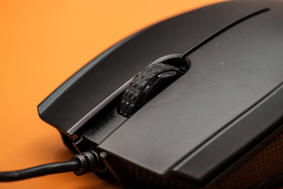 滚轮也是橡胶带颗粒,无论是日常的上网浏览,办公还是FPS游戏里面切换枪械都非常方便。不过,如果滚轮的厚度再增加一点就更好了