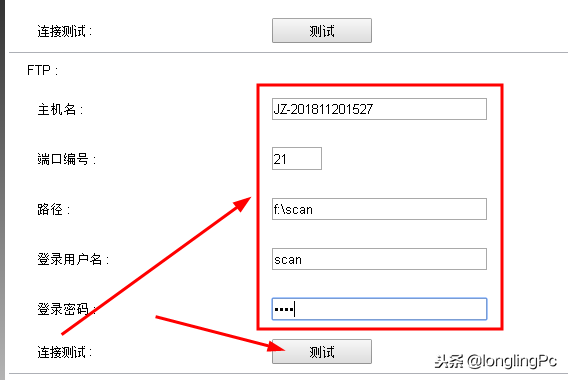 向 下找到FTP设置项,在主机名中输入计算机名称,端口编号不用改变,路径就是FTP目录,用户名及密码用新建的scan,