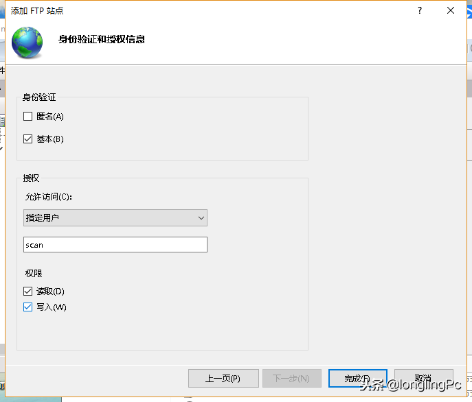 在身份验证中,选择基本,授权中选择指定用户,并把刚才我们新建的scan用户添加进去,即可完成FTP配置。