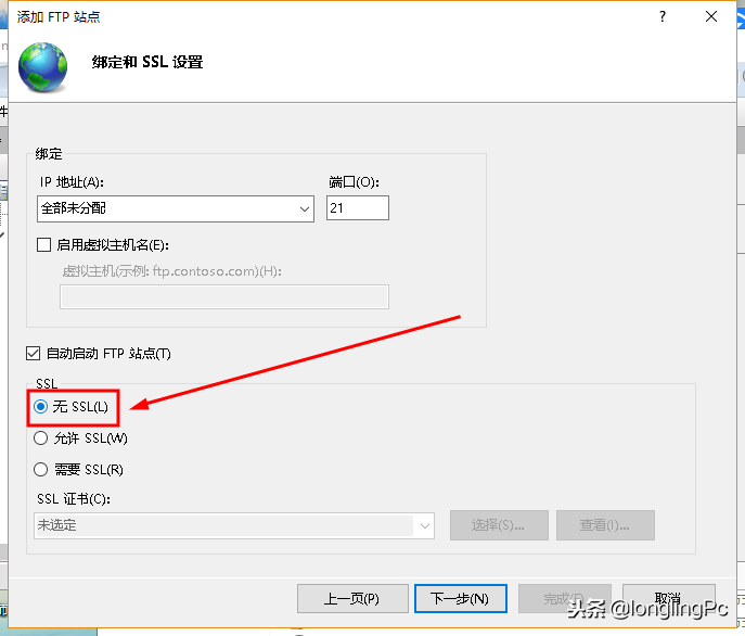 下一步中iP地址可以绑定,也可以不指定,并把加密选择为”无SSL“。