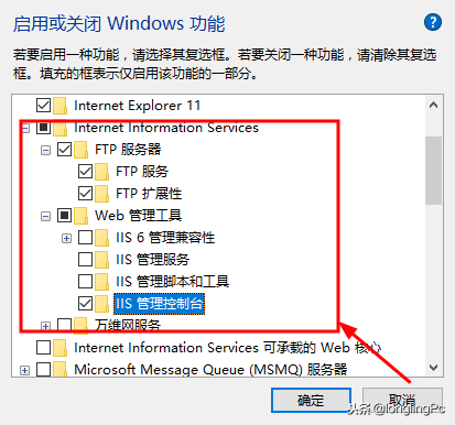 在例表中找到”internet Infomation Services”,把FTP服务器及IIS管理控制台勾选上。